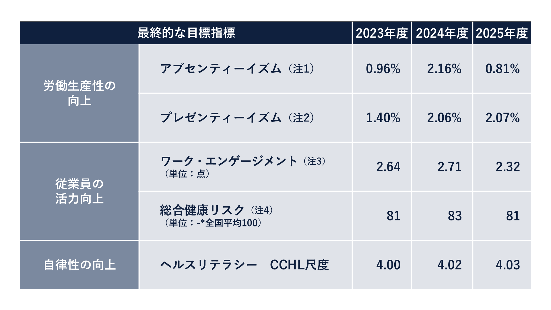 Ridgelinezでは、「アブセンティーズム」、「プレゼンティーズム」といった労働生産性に係る指標や、「ワークエンゲージメント」、「総合健康リスク」といった従業員の活力を測る指標を測定しています。