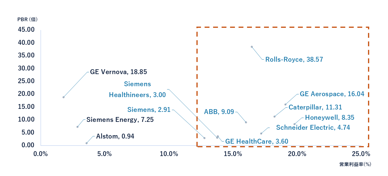本コラムでは、図中の赤枠領域に位置する営業利益率もPBR(※1)も高いプレーヤーに注目してきた。これらの企業は、営業利益率10%以上、PBRも3倍(一部例外あり)以上となっている。特にHoneywellやABB等はPBRが8倍を超え、市場から非常に高い評価を得ている(昨今の航空機需要増加を受け、エンジンOEMであるRolls-Royce (PBR39倍)、GE Aerospace (PBR 16倍)は特に高いPBRを示している)。