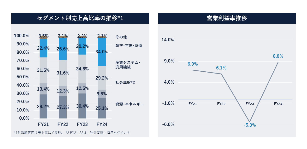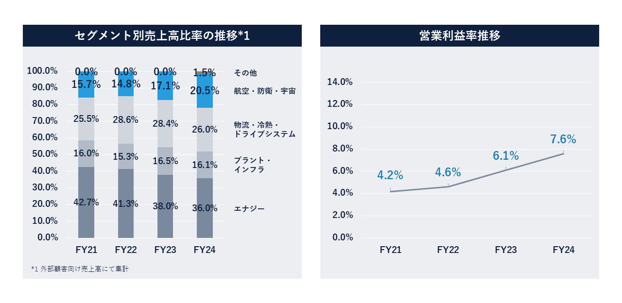 FY21からFY24における両社のセグメント別の売上高の比率と営業利益率の推移を図5、図6に示す。両社共に、航空・防衛領域への比重が高まっていることがわかる。また、営業利益率はそれに伴い増加傾向にある(※4)。