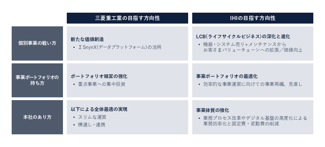 MHIは明確に本社のあり方に関する記述があり、「事業間の横通し」という表現で共通化・標準化を進めている。各事業が進めるバリューチェーンの最適化の動きと併せ、各プロセスにおける全社のベストプラクティス、失敗からの学び、変化の予兆を共有・定着させる活動を行っていくものと思われる。