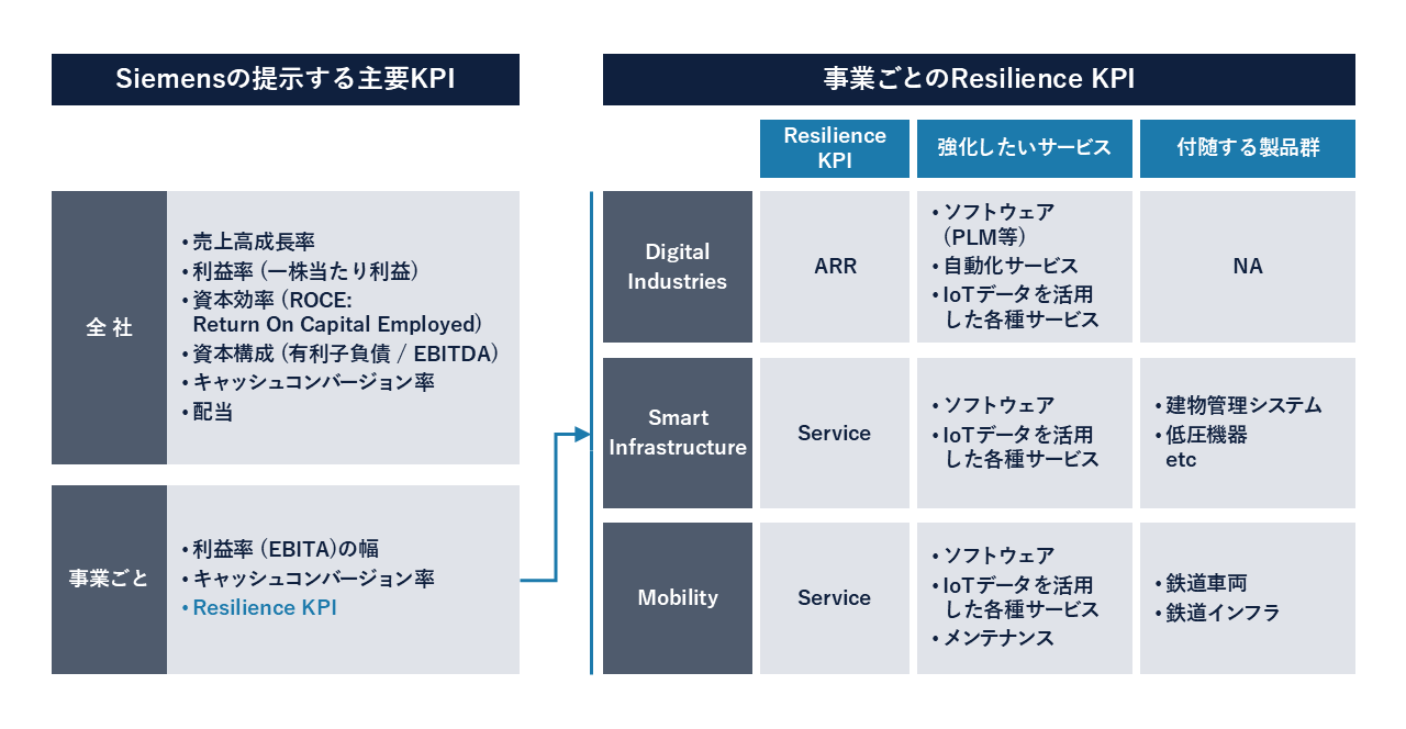 これは各セグメントの収益のレジリエンス、すなわち安定性を測るKPIという意味であり、事業セグメントごとにARR(Annual Recurring Revenue)、Serviceといった製品売切りではない形態、すなわちサブスクリプション型の収益が設定されている。