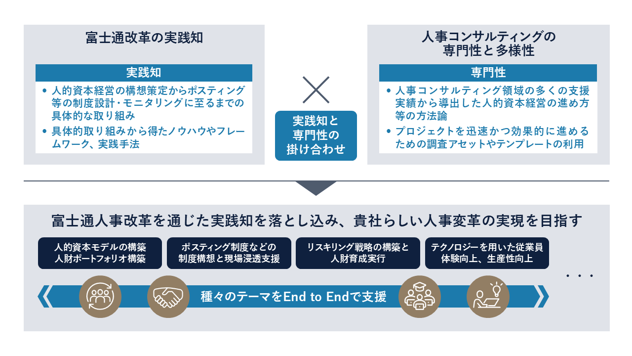 黒川 変革が現場に浸透しないという構造的課題に対して、どこをドライブするとより良く制度が浸透していくかという「構造化された実践知」を提供し、伴走するのが我々の価値となります。私たちは富士通の制度を“輸出”するのではなく、その裏にある「構造化された実践知」を提供します。制度が動く条件、新しい制度が従来の文化に浸透していくポイント、管理職が納得するプロセス──これらを各社の文脈に合わせてカスタマイズする。これこそが私たちの提供価値であり、実際に進めてきたからこそ備えている「構造化された実践知」です。