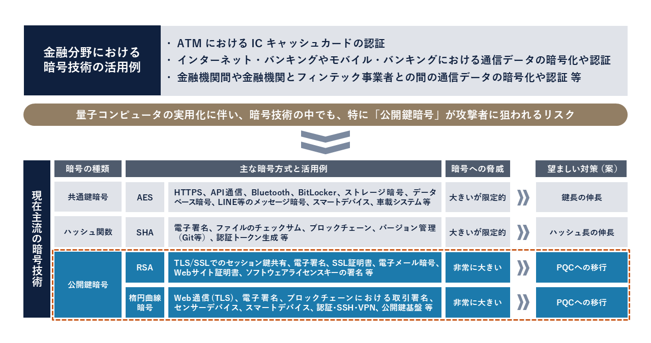 金融分野では、暗号技術は金融サービスおよび業務のセキュリティを支える重要な技術として広く活用されています。一方で、量子コンピュータの実用化が進むにつれ、暗号技術の中でも特に「公開鍵暗号」は、攻撃者に狙われるリスクが高まります。