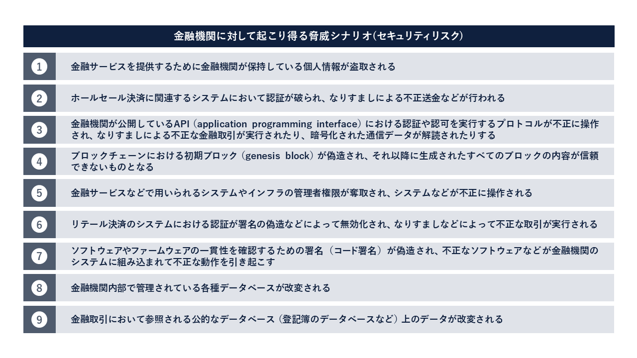 また、金融機関を想定した具体的な脅威シナリオもすでに公表されており、すでに多くの金融機関で発生している認証情報を不正に入手した口座の乗っ取りや悪用、個人情報の詐取によるインシデントが今まで以上に増加することが想定されています。