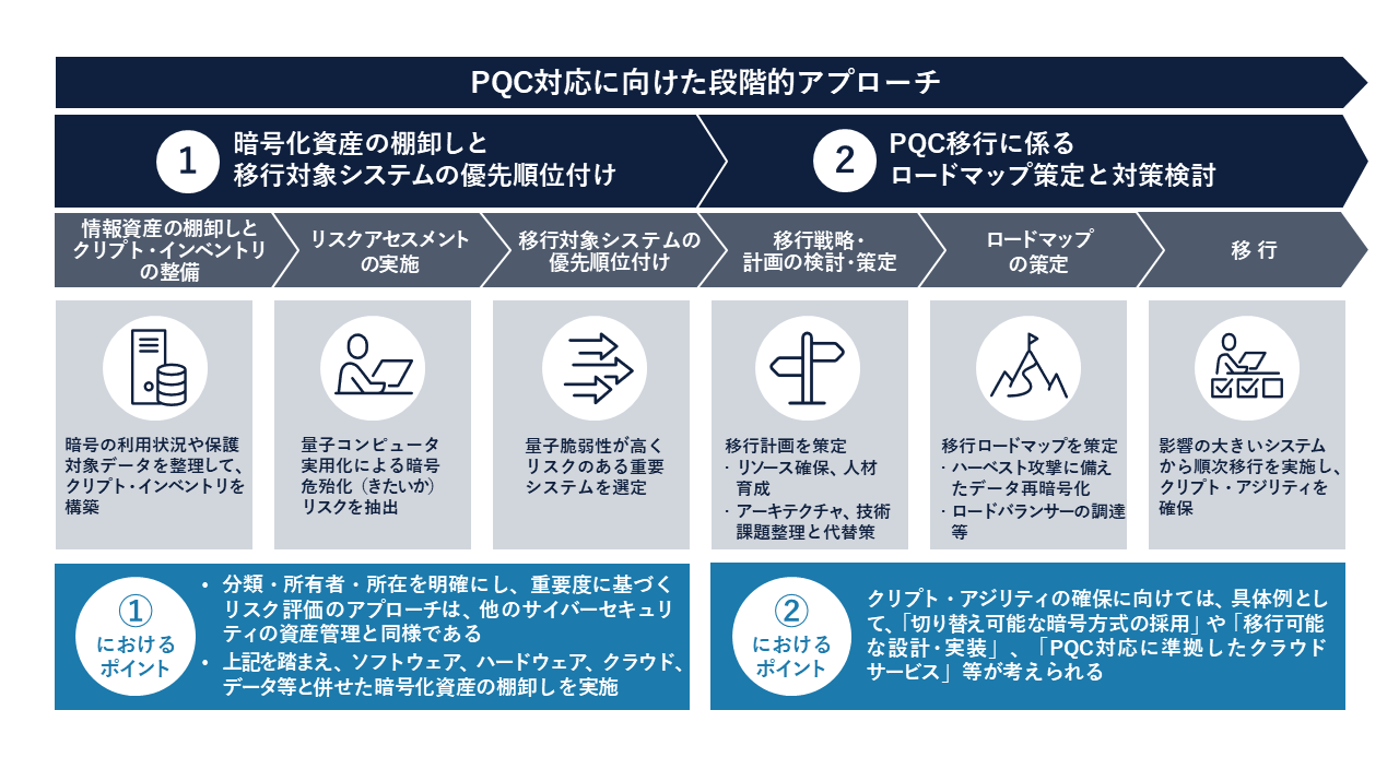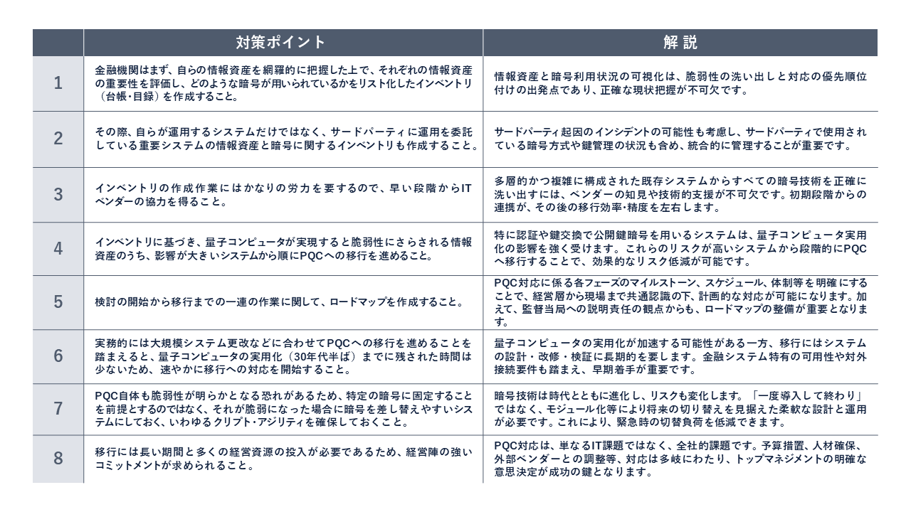 PQC対応にあたっては、金融庁が示す「8つの対策ポイント」を踏まえながら、以下の観点を押さえて段階的に移行することが肝要です。